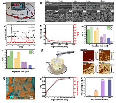 4. 银线路导电自修复修复条件:裂纹宽度 = 100 μmKNO3浓度 = 1.6 wt%,银线路与凝胶电解质接触面积 = 0.035 mm2(a) 模拟电路修复示意图(b) 银迁移产物在不同迁移时间下的形貌图像是上排图像中绿色圈出区域的放大图)(c) 不同迁移时间下银迁移产物的XRD谱图。(d) 不同迁移时间下裂纹间的电阻和电压。(e, f)银迁移过程中,与(e)阳极(f)阴极连接的银线路胶体电解质之间的电化学反应极化电阻。(g) AFM的测试示意图和(h) 不同迁移时间下Ag迁移产物沿生长方向横截面AFM电流分布图。(i) 迁移时间为360 minAgN元素在迁移产物截面上的分布情况。(j) 电流和自修复效率与迁移时间的关系。(k) 不同迁移时间下迁移产物中银枝晶的体积填充