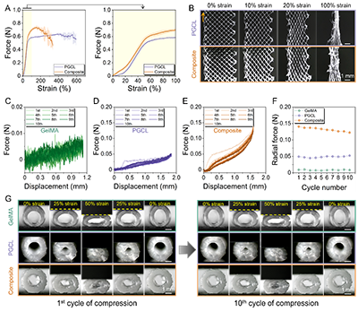 为进一步拓展应用场景,团队将PGCL支架与GelMA水凝胶复合,成功制备出兼具力学性能与生物活性的医疗器械。如4所示,对于平面支架,仅引入10%PGCL支架重量,即可使复合支架的初始拉伸刚度提升一倍;此外,PGCL赋予复合支架在初始加载阶段呈现典型J形应力-应变响应的力学特性,该特征与心肌等软组织的力学行为高度吻合,表明其具备在动态生理环境中的应用潜力。对于管状结构,复合管状支架充分发挥了GelMA的抗压性与PGCL的抗拉性,实现了力学的协同增强,在人工血管等领域中具备潜在优势。