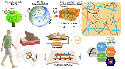 团队创新性地采用可聚合低共熔溶剂(PDES)策略,成功开发出一种可室温快速成型、多功能的高木质素凝胶体系。以甲基丙烯酰氧乙基三甲基氯化铵作为兼具氢键受体和阳离子聚合物基质功能的低共熔单体,以乳酸为氢键供体,体系可兼容超过20 wt%的木质素磺酸盐(LS)。在木质素磺酸盐及少量Al3?的协同作用下,该LS-PDES体系能在数分钟内于室温完成凝胶化,并支持开放式空气中的微图案化加工,最终获得具有优异离子导电性能的低共熔凝胶。该凝胶在-80℃至100℃的极端温度范围内表现出卓越的环境稳定性。高含量木质素的引入,在凝胶网络中构建了丰富的非共价相互作用,不仅显著提升了材料的力学韧性和通用黏附性,还赋予其自愈合、光热转换及抗菌等多重功能,综合性能优于以往多数低木质素负载凝胶系统。基于上述特性,团队进一步实现了多尺度软器件在室温环境下的便捷制造,包括可用于为可穿戴应变传感器供电的耐弯曲、抗冲击超级电容器,以及能在极端温度下稳定工作的可拉伸有机电化学晶体管(OECT)阵列。该高木质素含量低共熔凝胶体系,为印刷柔性离子电子器件、生物电子接口及类脑计算元件的研究与制造,提供了一条简单、绿色且高效的路径。