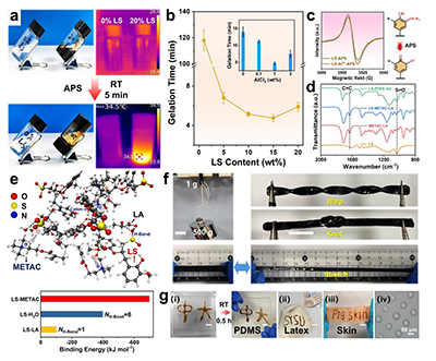 图2 (a) 室温下低共熔凝胶快速合成自放热自由基聚合及红外热成像图。(b) 凝胶化时间变化曲线图;插图为不同AlCl?含量下的凝胶化时间。(c) 捕获半醌自由基存在的电子顺磁共振(EPR)光谱。(d) 傅里叶变换红外(FTIR)光谱图。(e) 分子动力学(MD)模拟结果以及对应的结合能和每摩尔LS重复单元的平均氢键数量。(f) 低共熔凝胶在承重、弯曲、打结及拉伸条件下的照片。(g) 在室温开放环境下,多种弹性基底(包括聚二甲基硅氧烷(PDMS)(i)、乳胶手套(ii)及猪皮(iii))上书写制备20%LS-PDES低共熔凝胶,以及在PDM上印刷的LS-PDES凝胶微点阵列(iv)。