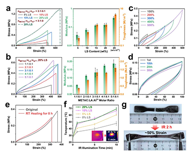 图3 LS-PDES低共熔凝胶的力学性能。(a) 不同LS含量和Al3?比例下LS-PDES低共熔凝胶的拉伸应力-应变曲线以及杨氏模量和韧性。(b) 含20 wt% LS且METAC:LA:Al3?摩尔比从1:1:0.1增至5:1:0.1时,LS-PDES低共熔凝胶的拉伸应力-应变曲线以及杨氏模量和韧性。(c) 低共熔凝胶在100%至500%应变范围内的循环加载-卸载曲线。(d) 低共熔凝胶在100%应变下的循环加载-卸载曲线,表明动态凝胶网络可在约3分钟内实现自恢复。(e) 原始LS-PDES低共熔凝胶与自愈合后凝胶的应力-应变曲线对比。(f) 不同LS浓度的LS-PDES低共熔凝胶在红外光照射下的温度变化。(g) 展示20%LS-PDES低共熔凝胶通过光热效应实现加速自愈合。