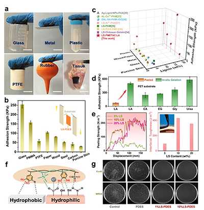 LS-PDES低共熔凝胶具备卓越通用黏附性,表面功能基团可使其牢固黏附玻璃、塑料、聚四氟乙烯及猪皮等。黏附优势源于凝胶与基底的多重协同作用,且随木质素磺酸盐(LS)含量提升同步增强,同时具备出色抗菌性,为新型胶粘剂、医用敷料及生物电子器件研发提供创新方案,应用前景广阔。