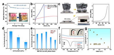 图5 (a) 初始含水量约22 wt%的LS-PDES低共熔凝胶在室温开放环境储存过程中的重量变化;插图为储存30天后仍保持拉伸性的印刷态低共熔凝胶。(b) 第7天脱水后的LS-PDES低共熔凝胶(分别含与不含MBA交联剂)的拉伸应力-应变曲线。(c) 脱水后LS-PDES低共熔凝胶具备高强度可支撑人体站立的照片及对应的压缩应力-应变曲线。(d) 不同LS含量的LS-PDES低共熔凝胶(METAC:LA:AlCl?摩尔比为3:1:0.1)的离子电导率。(e) 不同METAC:LA:AlCl?摩尔比下,脱水后LS-PDES低共熔凝胶的离子电导率。(f) 可聚合低共熔溶剂(PDES)、LS-PDES低共熔凝胶与聚甲基丙烯酰氧乙基三甲基氯化铵(PMETAC)水凝胶的差示扫描量热(DSC)曲线对比。(g) -40℃至100℃范围内,离子电导率(对数形式)随1000/T变化的曲线图。