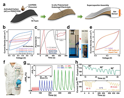 图6 基于LS-PDES的柔性超级电容器的电化学性能。(a) 泡沫镍电极间原位聚合LS-PDES凝胶电解质制备柔性超级电容器的示意图。(b) 采用涂覆型LS-PDES、原位聚合LS-PDES与活性炭(AC)电极的超级电容器,以及含原位生成电解质的器件在室温储存50天后的循环伏安(CV)曲线。(c) 采用PEDOT:PSS/LiTFSI电极的超级电容器的恒电流充放电(GCD)曲线及CV曲线(插图,扫描速率10 mV·s?1),表明器件输出电压可达1.8 V。(d) 涂覆PDES和20 wt%LS-PDES的载玻片承受冲击的照片。(e) 采用20 wt%LS-PDES电解质的超级电容器在承受100次连续冲击测试后的性能保留率。(f) 集成超级电容器电源与指上LS-PDES传感器用于运动监测的照片。(g) LS-PDES传感器的电阻响应随施加应变变化的曲线图。(h) 在柔性超级电容器供电下,手指弯曲时的实时电流响应。(i) 25℃和0℃下的实时应变响应,以及光热效应辅助下低温环境中传感性能的恢复情况。