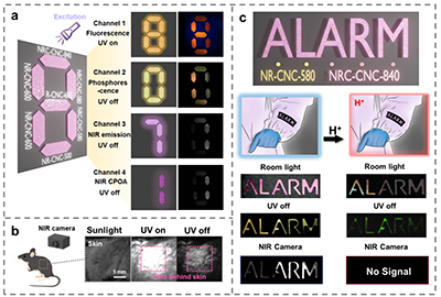 基于以上材料近红外区响应、圆偏振发光、长寿命、高不对称、可动态响应等诸多优点,该材料体系展示出在多通道信息加密、防伪标识等方面的潜力;同时,近红外长余辉的低噪音背景优势也使其有望拓展至生物成像与化学/环境传感等应用场景。