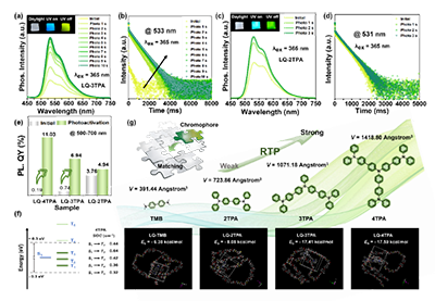 高效室温磷光弹性体材料:该研究成功突破了柔性材料难以实现高效磷光的共性难题,设计出的LQ-4TPA材料在多项性能上取得显著平衡:不仅实现了长达532毫秒的磷光寿命与11.03%的磷光量子产率,同时具备315%的断裂伸长率和高达50%的热驱动应变,在柔性光电材料领域实现了磷光效率与力学-驱动性能的高水平协同。