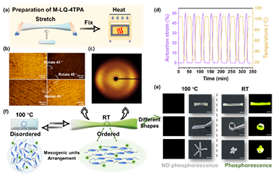 针对上述挑战,李振教授团队创新性地设计了一种磷光液晶弹性体材料。该材料兼具液晶相与高分子软弹性的特点,其液晶结构可借助刚性棒状分子的有序排列和分子间相互作用实现高度组织化,进而有效抑制非辐射衰减并促进磷光发射,成功在聚合物体系中实现了宏观柔性与微观刚性的平衡。而且,当受到温度刺激扰动时,材料的介晶单元能够发生各向同性至各向异性的可逆转变,从而赋予其动态驱动性能。此项研究不仅揭示了微观刚性与宏观柔性在构建高性能室温磷光聚合物中的平衡机制,也为拓展该类材料在柔性可视化、智能驱动等前沿领域的应用提供了新思路。
