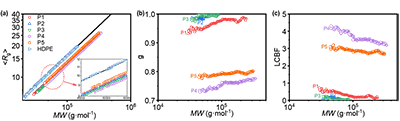 研究团队进一步使用高温三检GPC解析POE链结构,发现每条共聚物链上LCB数目为0~4.5个,证实PEM能有效参与共聚形成LCB。流变研究结果为此提供佐证:SAOS测试显示,部分样品在储能模量主曲线低频区终端斜率显著低于线性聚合物,Cole?Cole图呈现偏离理想半圆特征且高黏区上翘,黏流活化能超过40.8 kJ/mol。这些特征表明该LCB POE具有优异的熔体强度与更宽的加工窗口。