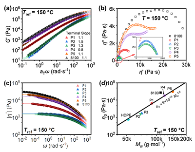 图4 共聚物(a)储能模量主曲线、(b)Cole–Cole 图、(c)粘度主曲线与(d)零切粘度与重均分子量关系图,参考温度150 °C