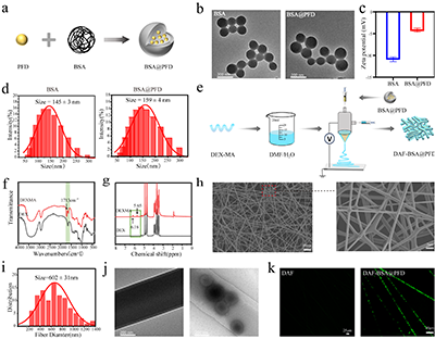 该研究以具有良好生物相容性与可修饰性的甲基丙烯酰化硫酸软骨素(CA)作为水凝胶基质,同时通过同轴静电纺丝技术制备了以甲基丙烯酰化葡聚糖为壳层、包载吡非尼酮白蛋白纳米颗粒(BSA@PFD)为核的纳米纤维网络。扫描电镜与透射电镜表征结果表明,所得纳米纤维具有清晰的核壳形貌、均一的直径尺寸,且载药纳米颗粒在纤维芯层内部分布均匀(图2),为药物的可控释放奠定了结构基础。