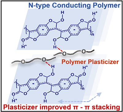 文章针对 n 型导电聚合物 PBFDO 固有拉伸性能不足的关键难题,提出基于氢键介导的聚乙二醇(PEG)插层策略:通过 PEG 嵌入 PBFDO 的面外层状堆积结构,既提升了聚合物链段的运动能力以实现应力耗散,又促进了面内π电子离域,从而同步优化材料的电荷传输性能与环境稳定性。