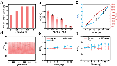 图2 PBFDO- PEG复合薄膜的力电性能表征。a) 不同PEG固含量下PBFDO-PEG薄膜裂纹起始应变的变化。b) 不同PEG固含量下PBFDO-PEG薄膜的电导率。c) 拉伸过程中PBFDO-PEG薄膜的电阻与电导率变化。d) PBFDO-PEG薄膜在100%应变下经1000次循环的电阻变化;以及在不同储存条件下d) 0%应变和e) 100%应变状态下,经15天储存后薄膜的电阻变化。
