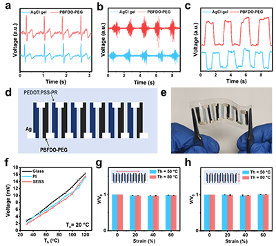 图4. PBFDO-PEG材料在电生理信号记录与热电设备中的应用。a) 心电图信号,b) 表面肌电图信号,c) 眼电图信号;分别由Ag/AgCl凝胶电极与PBFDO-PEG电极测量所得。d) 全印刷热电设备结构示意图。e) SEBS基底上的全印刷热电设备。f) 不同基底上全印刷热电装置的输出电压。沿装置纵向(g)和横向(h)方向的单轴拉伸测试,在冷源温度(Tc)为20℃及热源温度(Th)分别为50℃和80℃时热电装置输出电压的变化。V/V?为不同应变速率下输出电压(V)与初始输出电压(V?)之比。