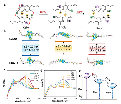2.aUPy二聚体的ESPT发光机制示意图。(b通过TD-DFT模拟计算UPy基元三种互变异构体在S1激发态下的能隙。c,d采用泵浦-探测系统监测PU-UPy聚合物薄膜的fs-TAS光谱eUPy二聚体光物理过程的Jablonski能级图