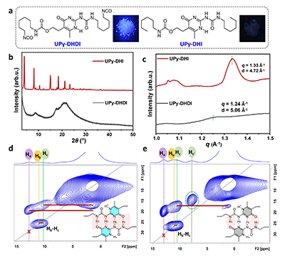 3. 模型化合物UPy-DHDIUPy-DHI的(a)分子结构(插图为在365 nm紫外灯照射下的样品照片)。(bXRD谱图。(c)广角X射线散射谱图。(d, e)高分辨二维1H DQ/SQ相关固体NMR谱。