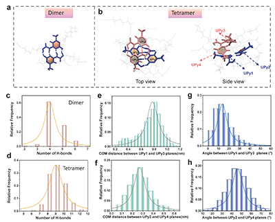 4. UPy基元的分子动力学模拟。(a, b) 分子动力学模拟UPy-DHDI二聚体和四聚体的空间结构。(c, d) UPy二聚体与四聚体中氢键数量的统计分析。(e, f) 四聚体内两个UPy平面之间质心距离的统计分析。(g, h) 四聚体内两个UPy平面之间夹角的统计分析。