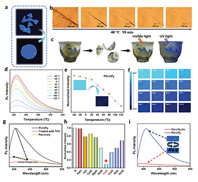 5. PU-UPy样品(a)回收前后在365 nm紫外灯照射条件下的照片。(b)自愈合前后的光学显微镜图像。(c)作为荧光粘合剂修复的陶瓷杯在可见光与紫外光下的照片。(d)不同温度的光致发光光谱。(e)光致发光强度随温度变化曲线。(f)不同温度下的荧光显微镜图像。(g)三氟乙酸处理前后的光致发光光谱。(h)不同金属离子作用后的相对光致发光强度。(i)氯化铁溶液(0.001M)处理前后的光致发光光谱。