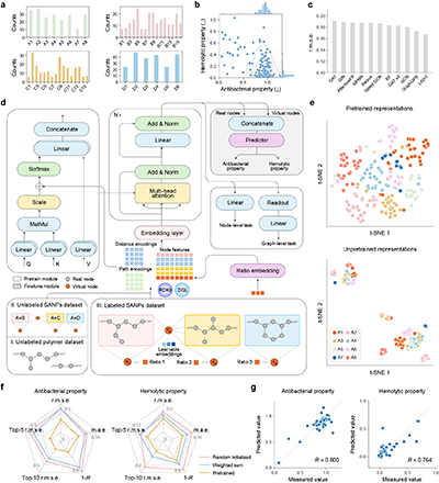 作者首先通过随机抽样的形式来构建200余个初始标注数据,他们发现大多数样本表现出抗菌性,而少数具有抗菌性的样本则表现出高溶血性这突显了在实现高抗菌性和低溶血性之间取得平衡的挑战,强调了AI在指导高分子抗生素设计中的重要价值。随后作者团队利用初始数据评估了模型表现,结果表明提出的多阶段学习策略可以在数据稀缺场景下显著提升模型性能(图2)。