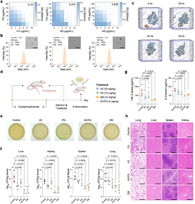 6 | SANPs与抗生素的协同治疗效果。a-c, H13PG共组装。d-h, 小鼠腹膜炎实验结果。