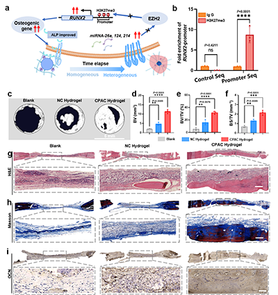 3:(aCPAC水凝胶产生的力学刺激调节成骨基因表达的细胞通路示意图;bChIP-qPCR分析显示H3K27me3占据RUNX2的启动子位点;(c)BlankNCCPAC水凝胶组植入后8周的Micro CT显示骨缺损修复效果。8周后分别定量(d)骨体积(BV)、(e)骨体积/总体积(BV/TV)、(f)骨表面积/总体积(BS/TV(g) BlankNCCPAC水凝胶组骨缺损的H&E染色,(h)马松三色染色。(i) BlankNCCPAC水凝胶组OCN免疫组化染色