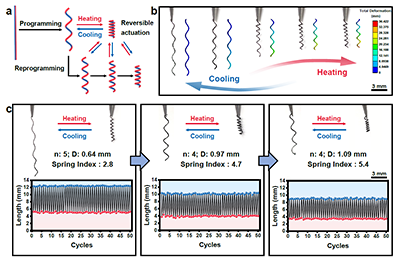 更为重要的是,该Janus纤维突破了传统纤维驱动体系中结构一次固化的限制,展现出基于动态网络的可重构驱动特性。依托PU网络中的动态共价键交换,液晶介晶单元的取向状态能够在保持高力学稳定性的前提下被反复重排,使同一根纤维可在不同螺旋构型之间实现稳定切换,而无需重新制备。实验结果表明,在多轮热驱动与结构重构循环中,纤维的界面完整性与驱动幅度均保持高度一致,几乎未观察到明显疲劳衰减,体现出优异的长期服役可靠性(图3