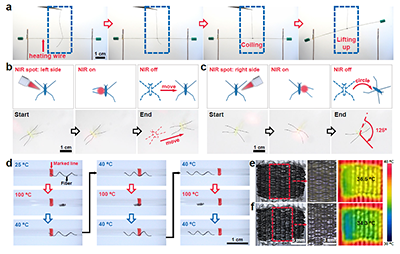作者进一步提出并验证了多种基于材料非对称响应的形状编程策略:既可在室温条件下利用LCE的软弹性实现机械诱导纤维自发卷曲,也可在高温下借助PU的应力松弛行为完成热诱导编程,并结合近红外激光实现空间选择性激活,从而在单根连续纤维中引入驱动行为的空间异质性(图2