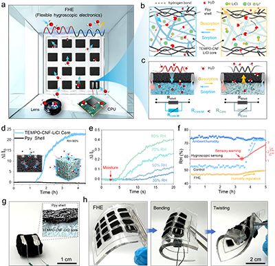 近期,中国科学院宁波材料技术与工程研究所海洋关键材料全国重点实验室陈涛研究员和肖鹏研究员提出一种全新的材料设计思路,通过“界面限域聚合”和“阵列化集成”构筑了一种基于核壳聚合物凝胶的柔性吸湿电子器件(FHE),有效集成吸湿感知和湿度调控功能,实现对吸湿-解吸动态过程的实时监测以及智能化湿度管理。