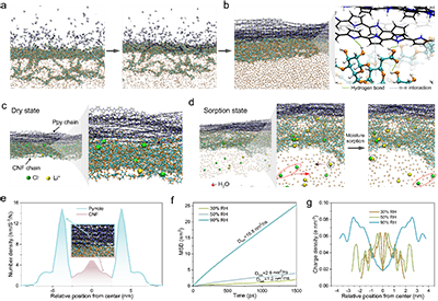 3. FHE凝胶单元形成和离子扩散动力学模拟。(aTEMPO-CNF气凝胶表面Ppy链形成的MD模拟。(bPpy壳形成和核壳分子力的MD模拟。Li+Cl-c)干燥状态和(d)吸湿状态下在TEMPO-CNF气凝胶内核中的扩散运动和变化。(e)根据MD模拟默认程序格式计算的吡咯和TEMPO-CNF数量密度。(f)在30%50%90%相对湿度下,Cl-Li+TEMPO-CNF气凝胶内核扩散的均方位移(MSD)。通过拟合MSD数据获得离子的扩散系数。(gTEMPO-CNF气凝胶在30%90%相对湿度下相对位置的电荷密度。