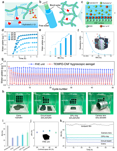 4. FHE的吸湿性能表征和湿度管理应用。(aFHE与水分子的氢键相互作用和LiCl水合过程示意图。(b)水分子的氢键相互作用示意图。(cFHE单元吸湿感知过程中水合Cl-Li+定向运动示意图。FHE30%95%的相对湿度变化下的(d)吸湿性能和(e)最佳吸湿值。(f)在不同相对湿度下FHE单元的电阻值。(gFHE单元和TEMPO-CNF吸湿气凝胶的循环吸附-解吸测试。(h)由密封的亚克力盒子封装的FHE和精密物品组成的湿度调控系统的光学图片。FHE在硬币、电路板、CPU芯片和相机镜头密闭环境下的(i)湿度调节性能和(j)相对湿度变化。(kFHE的长期湿度调控性能。