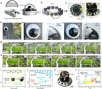 6. FHE应用于监控镜头有效湿度调控-预警系统。(a)精密镜头湿度调控-预警系统系统包括透明屏蔽、镜头电路板机构和FHE。(bFHE阵列的图示和(c)光学图像。(d)室外精密透镜的光学图像。(e对照组:破裂的监控摄像头的室外光学图像和(f)暴露在高湿度环境中的带有FHE的破裂监控摄像头。(g)通过监控镜头拍摄的室外图像,镜头外壳有裂纹,以及(h)通过FHE集成的监控镜头拍摄的图像,同样暴露在高湿度环境中,外壳有裂纹。FHE单元的吸湿感知使i密封监控镜头设备中保持稳定湿度以及在破裂控镜头设备中保持长时间湿度稳定。(k)精密镜头湿度调控-预警系统中RH感知探头的光学图像。(l)暴露在高湿度环境中的FHE集成的破裂监控镜头对照组的相对湿度变化曲线。