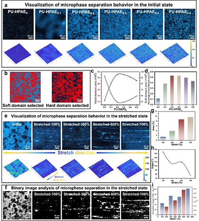 聚氨酯(PU)弹性体作为一类重要的高分子材料,因其优异的机械性能和广泛的应用前景而备受关注。然而,传统聚氨酯材料中普遍存在的强度与韧性之间的固有矛盾,限制了其在高端领域的应用,且其微相分离结构难以实现无损原位观测,严重制约了材料性能的精准优化。近日,中南民族大学超支化聚合物团队张道洪教授、姜宇教授与阿卜杜拉国王科技大学Nikos Hadjichristidis教授合作,在超支化聚氨酯弹性体的结构设计、性能优化及微观结构原位可视化方面取得重要研究进展。