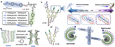 图1. 以单一手性偶氮苯基团作为α末端、带有不同取代基的非手性偶氮苯作为侧链的手性多米诺型聚合物的结构示意图与受D-A效应调控的手性传递机理。