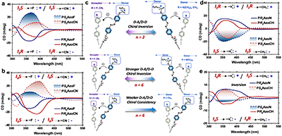 图2. 在混合溶剂中测得的不同Azo聚合物聚集体的手性表达与手性反转行为。