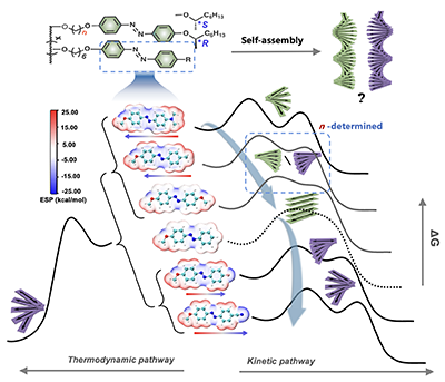 图5. 不同电子效应模式调控下D-A型侧链偶氮聚合物复杂自组装行为的能量示意图。(内嵌:侧链模型偶氮基团的静电势分布)