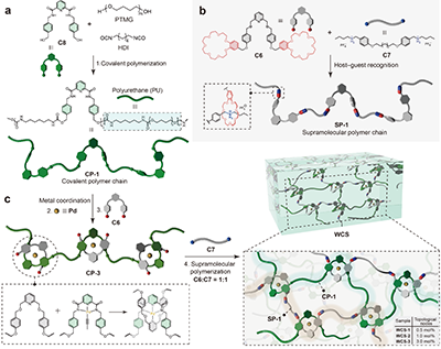 图1. 通过拓扑缠结交联的协同共价与超分子聚合物网络(WCS)的示意图。