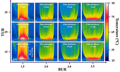 图1. 红外热图展示不同吹胀比(BUR)和牵引比(TUR)条件下,吹膜过程中PBAT膜泡的温度分布。(采用统一的气流速度,以确保相同的冷却速率)