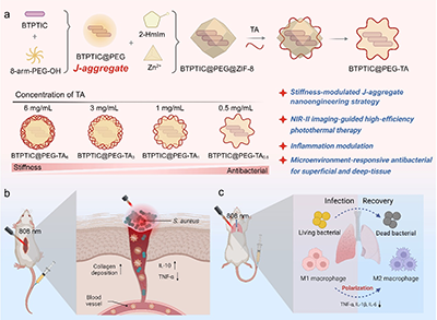 近日,山东大学崔基炜教授和山西大学冯丽恒教授合作团队开发了一种负载J-聚集体的金属-多酚超分子纳米胶囊,可控的纳米胶囊硬度能够改善其在细菌感染部位的富集和在生物膜中的渗透能力,最终实现NIR-II成像引导的高效抗菌光热治疗。该工作的创新之处在于:制备得到的纳米胶囊具有NIR-II荧光成像和优异的光热转换效率(82.1%),并且证明了较软的纳米胶囊在感染部位具有更优异的富集效率和生物膜渗透能力,从而显著提高抗菌效果。此外,该纳米胶囊在酸性感染微环境中能够发生降解,释放出具有抗炎效果的单宁酸(TA),实现协同抗炎。该递送系统整合了NIR-II成像、高效光热治疗和抗炎三种功能,结合对胶囊硬度的调控,可有效治疗浅表或深层组织的细菌感染,为高效抗菌纳米材料的设计提供了新的思路。