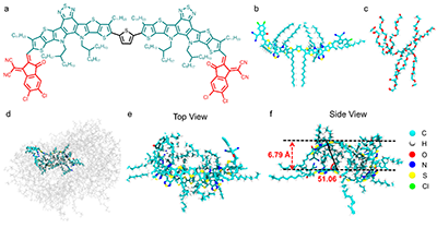 图2.(a)BTPTIC的分子结构。(b)8-arm-PEG-OH和(c)BTPTIC在分子动力学模拟中的结构模型示意图。(d)BTPTIC和8-arm-PEG-OH组装后的图片。BTPTIC聚集体的(e)俯视图和(f)侧视图。