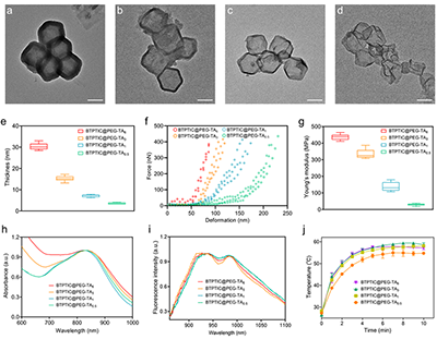 图3.(a)BTPTIC@PEG-TA6、(b)BTPTIC@PEG-TA3、(c)BTPTIC@PEG-TA1和(d)BTPTIC@PEG-TA0.5纳米胶囊的TEM图片。比例尺为150 nm。(e)BTPTIC@PEG-TA纳米胶囊的壁厚。BTPTIC@PEG-TA纳米胶囊的(f)力-变形曲线和(g)杨氏模量。BTPTIC@PEG-TA纳米胶囊的(h)吸收光谱、(i)发射光谱和(j)光热升温曲线。
