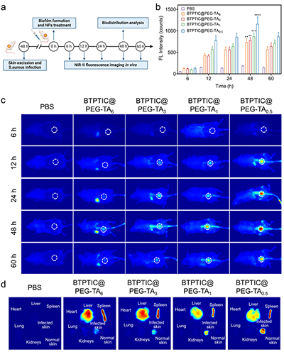 图5.(a)NIR-II活体荧光成像实验流程示意图。(b)经尾静脉注射PBS及不同硬度的BTPTIC@PEG-TA纳米胶囊后,细胞感染模型小鼠伤口部位的荧光强度统计数据及(c)对应的活体NIR-II荧光图像。(d)经尾静脉注射不同硬度的BTPTIC@PEG-TA纳米胶囊,48小时后小鼠体内的分布情况。