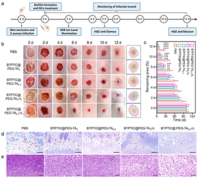 图6.(a)小鼠细菌生物膜伤口建模和治疗的流程示意图。(b)伤口愈合过程的照片和(c)伤口面积统计数据。治疗第5天伤口处组织的(d)Giemsa和(e)H&E染色图片。