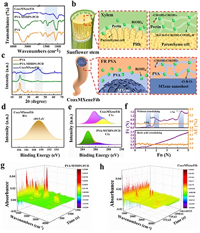 图 2:PVA-MTHPS-PCD与CoaxMXeneFib的化学结构表征与界面增强机制