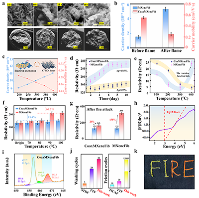 火焰作用后,CoaxMXeneFib芯层形成鱼鳞状结构并转化为互连导电网络,而单一MXene纤维则严重氧化,证实鞘层可有效隔绝氧气与水分。霍尔效应测试表明,燃烧后纤维呈现n型半导体特性,载流子浓度与迁移率均高于对比样品。变温霍尔分析进一步显示,在200–400℃区间内,C/N?TiO?网络载流子浓度显著上升,晶格散射受掺杂效应抑制,载流子迁移加速,从而迅速建立导电通路、触发预警。在80℃环境中放置10天,其电阻率仅增长16.65%,高温氧化稳定性显著优于普通MXene纤维。凭借卓越的耐磨、耐洗和耐高温氧化性能,CoaxMXeneFib 可缝制于消防服,还能与微控制器及物联网通信结合,构建远程无线火灾报警平台,2 秒内触发报警并同步至终端设备,为智能消防系统提供核心材料支撑。