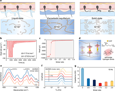 非侵入型电生理监测与脑机接口技术的发展,为神经系统状态评估、疾病诊断及人脑功能解析提供了直接窗口。但其应用长期受制于皮肤-电极界面失配,在动态、不规则的皮肤表面(尤其是多毛头皮表面)难以实现高保真的电生理信号采集。水凝胶与液态材料初期接触良好,但内聚性差且容易脱水,信号质量在数小时内显著下降;固态材料虽稳定性好,却因难以共形接触而诱发高界面阻抗影响信号传输;近年来发展的相变材料试图在接触后由液态转变为固态,但其相变窗口窄,残余弹性仍难以适应复杂的现实监测情景。当前界面材料始终面临着液态适应性与固态稳定性的固有权衡。因此,在分子尺度上实现二者的调和,将成为神经接口性能跃升的关键突破口。