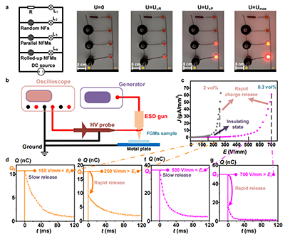 基于上述新的认识,研究团队利用大面积静电纺丝技术将纳米纤维膜以不同构型(分别为水平、垂直及卷绕取向)及负载量复合到聚合物介电基体中,所得环氧纳米复合材料在创纪录的低填充量(0.3 vol%)下展现出优异的电场调控性能与电荷释放能力(图4)。由发光二极管与环氧纳米复合材料构成的保护电路验证了该功能梯度材料的优越性与快速响应特性(图5)。该工作提出的策略为解决高电场乃至放电环境下实现优异电场自适应调控性能这一难题提供了有价值的思路。