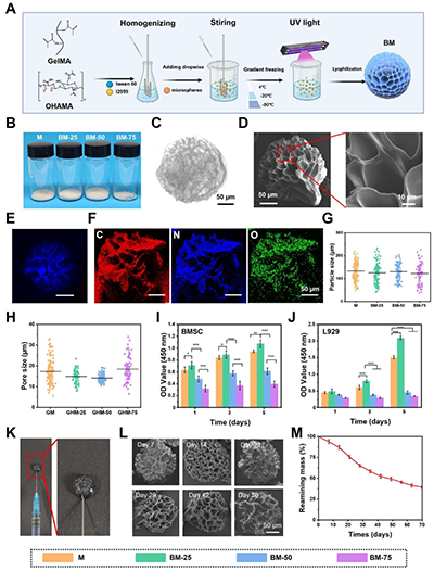 传统3D细胞培养方式,如悬滴法或微孔板培养,虽然能够形成细胞团,但普遍存在营养交换受限、细胞凋亡增加等问题;同时,大多数外泌体载体与组织结合能力弱,容易在体内扩散流失,降低治疗效率。为解决这些难题,研究团队设计了一种由甲基丙烯酰化明胶(GelMA)与氧化透明质酸甲基丙烯酸酯(OHAMA)组成的多孔凝胶微球。OHAMA上的醛基可与蛋白上丰富的氨基形成动态席夫碱键,使微球具备独特的三重生物粘附能力: