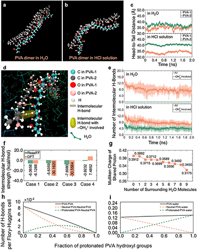 在传统PVA水凝胶形成过程中,聚合物链间的氢键往往在早期迅速建立,这虽然能够稳定结构,却同时限制了链段的重新排布空间,导致网络内部存在不均匀区域。研究团队提出,通过酸处理对PVA链段进行可逆质子化,可以暂时削弱氢键作用,让链条在凝胶化初期拥有更高的自由度,先让链段充分重排,形成均一网络,再通过后续处理将结构固定下来。基于这一理念,团队发展了“酸化—冻融—盐析”的加工路径。其中,酸化处理调控链段质子化状态,抑制过早氢键形成;冻融循环诱导形成基础凝胶网络;盐析处理强化链间相互作用并形成稳定的结晶物理交联。这一多阶段过程使得分子取向与网络结构能够逐步优化,从分子尺度到宏观结构实现协同强化。