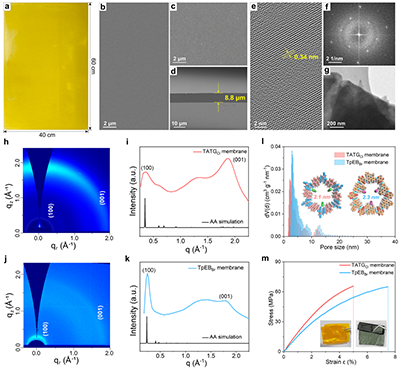 为此,中国科学技术大学徐铜文教授、李兴亚特任教授团队报道了一种溶剂化介导组装策略(SMA)(图1),成功合成了面积达~2400 cm2、拉伸强度为~65 MPa的大面积自支撑COF膜(图2)。通过原位加热液体透射电子显微镜可视化了溶剂介导的成核、生长、结晶及组装过程,结合多尺度模拟详细阐明了膜形成过程中的溶剂化相互作用(图3)。该方法具有很好的普适性,可以实现一系列不同荷电性质和拓扑连接方式COF膜的制备。