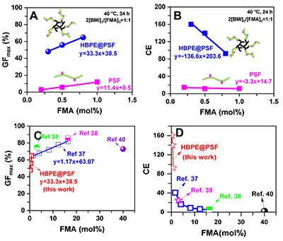 在此基础上,对所得共聚物的可逆交联行为进行了比较研究。在控制条件下利用交联剂BMI通过DA反应分别对HBPE@PSFPSF进行可逆交联,重点考察了聚合物链形态对可逆交联速率及效率的影响规律。研究发现,与具有线形链形态的PSF体系相比,具有超支化多臂形态的HBPE@PSF体系呈现出显著更快的可逆交联速率(4),以及显著更高的可逆交联效率(5)。例如,对于HBPE@PSF体系,当可逆交联组分FMA比例仅为0.50 mol%,其可逆交联效率可达139.8,是对照体系PSF12倍。