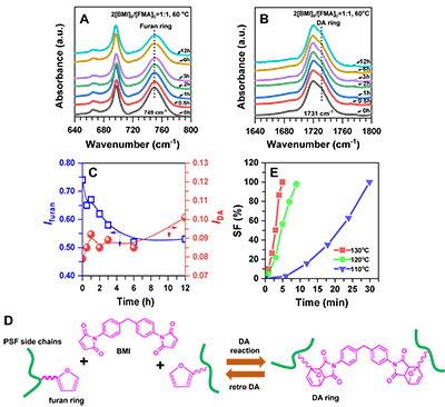 进一步利用FTIRHBPE@PSF体系中的可逆交联机理进行了研究(6)。研究显示,随着固化时间的延长,体系中呋喃环的红外吸收强度随之逐步下降,与此同时,通过DA反应所形成的DA环的红外吸收强度随之逐步增加。此外,在110?130 oC下对固化后样品进行解交联试验,发现各个温度下样品的解交联程度均可以达到100%,随着温度升高解交联速率相应增加。表明所述HBPE@PSF的可逆交联系通过DA反应而实现。